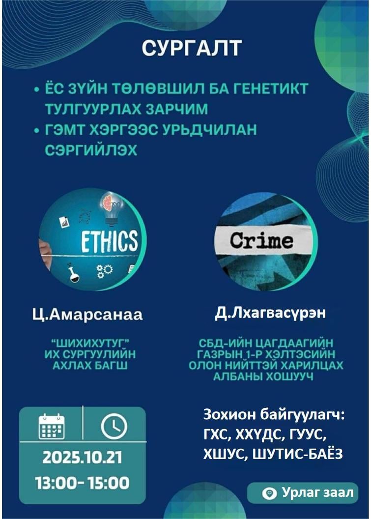 2025 оны 10-р сарын 21-ний өдөр ШУТИС-ийн ГХС-ийн санаачилгаар ХХҮДС, ГУУС, ХШУС болон БАЁЗ-н хороо хамтран багш, ажилтанд зориулсан “Ёс зүйн төлөвшил ба генетикт тулгуурлах зарчим”, “Гэмт хэргээс урьдчилан сэргийлэх тухай” сэдэвт семинарыг зохион байгууллаа.