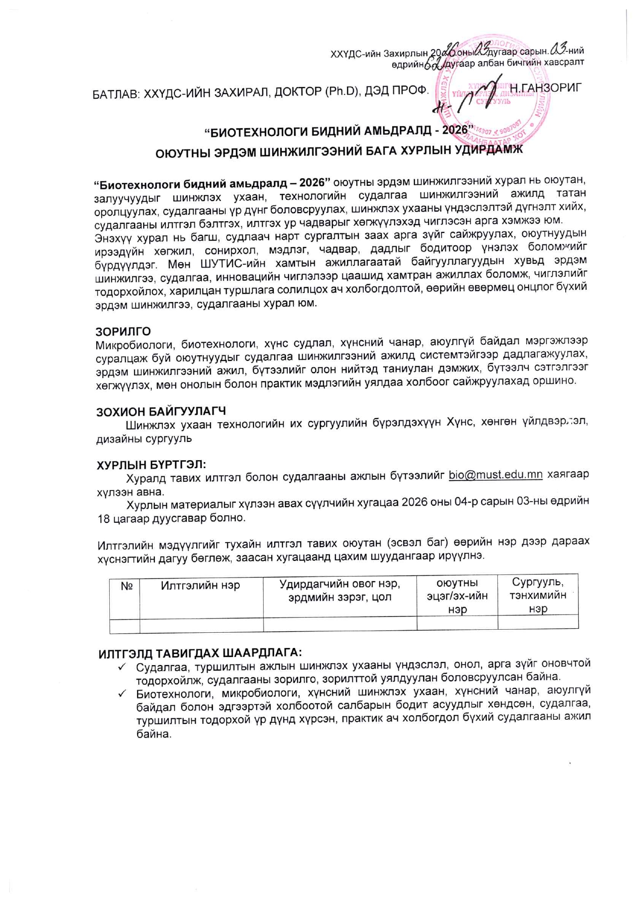 “Биотехнологи бидний амьдралд – 2026” Оюутны эрдэм шинжилгээний бага хурал зохион байгуулагдана.